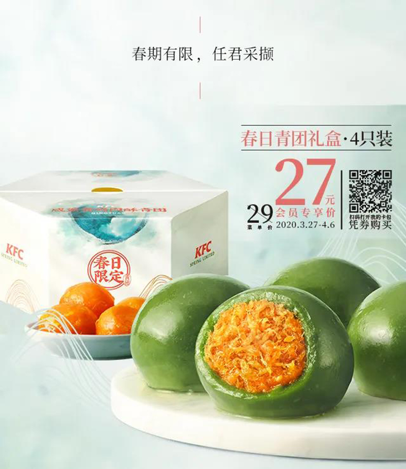肯德基咸蛋黄鸡肉酥青团于2020年3月27日起上市,全国售卖数量为182万只,售完即止,现美罗城门店还有余量(9:30-23:00供应),欲购从速~此外,另有春日限定春日新生桶即日至2020年4月6日9:30-23:00有售。