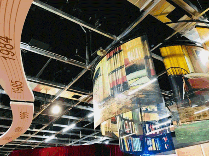 馆内大厅巨幕,用特别制作的《小夜曲》《我住长江头》《星光灿烂》等数首经典黑胶老歌影像,串联起科学家钱学森与他的夫人、艺术家蒋英相伴一生走过的风雨路程,艺术、形象地再现了这段传奇。