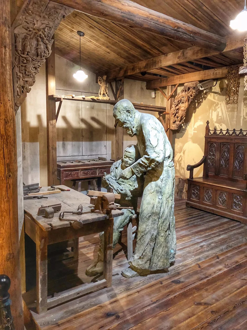 赏析他的雕刻艺术不难发现土山湾的烙印。2003年出版《黄杨木雕第一家》,其中耶稣背十字架、圣母抱耶稣、耶稣逃难、若瑟等《圣经》题材的作品,占了木雕部分版面的20%。
