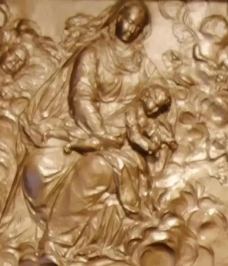 左上方圣母玛利亚怀抱圣子耶稣显现。